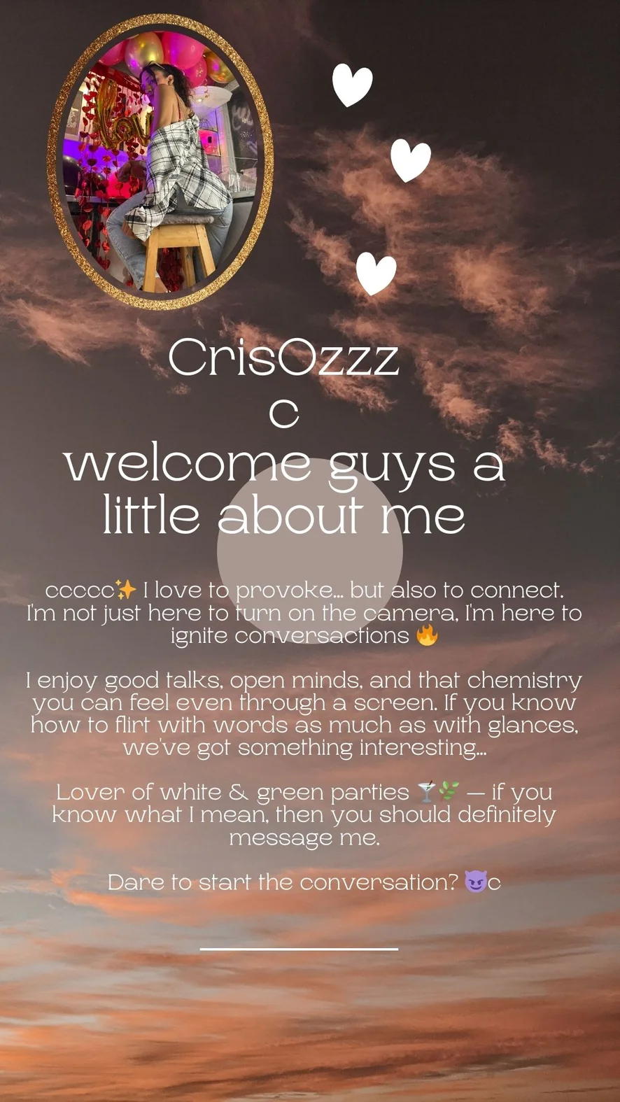 Disfruto las buenas charlas, las mentes abiertas y esa química que se siente incluso a través de la pantalla. Si sabes coquetear con palabras tanto como con miradas, ya tenemos algo interesante…